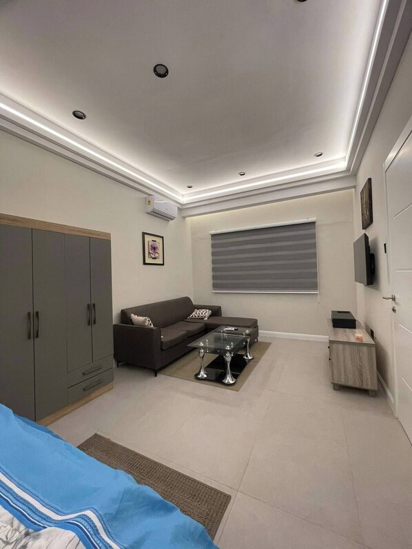 This stylish space features a comfortable queen-sized bed, a fully equipped kitchenette, and a bright living area, perfect for relaxing after a day of exploring. Enjoy modern amenities like Wi-Fi, air conditioning, and a flat-screen TV.
