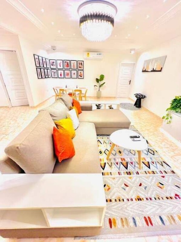In the heart of Accra, this fully furnished 2-bedroom apartment is a home away from home. Enjoy an inviting living area with a Smart TV and A/C, two cozy Queen-sized bedrooms with office areas and Smart TVs, as well as ceiling fans in every room.