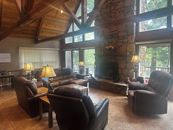 TV, fireplace - Beautiful waterfront home on Grand Lake, Fire pit, private dock in Fishtail Cove (Afton)