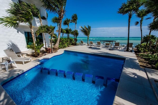 Just outside the doors and conveniently accessible from all buildings, you will find stunning tropical gardens bordering a magnificent pool with Caribbean vistas. There’s plenty of room to relax here with outdoor dining, pool-side lounge chairs and side tables. An outdoor shower finished in marble provides an elegant space to clean the sand off at the end of a relaxing beach day. If you fancy an outdoor meal, you will find a “kitchen palapa”, equipped with a large gas grill, bar refrigerator (which can be stocked upon request), bar stools and a special dining table designed from the cross-section of a large tree.