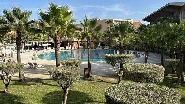 The balcony offers outdoor furniture, with a table and chairs to enjoy breakfast outdoors with a view of the pools and garden.
