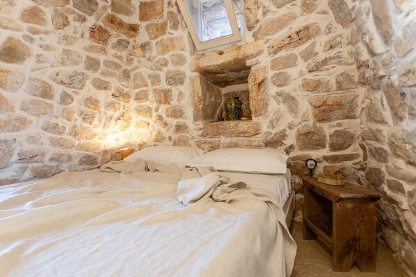The protagonist of this setting is the trullo, lovingly restored with care and respect for tradition: Trullo Timo preserves the architectural charm of the rural homes of the past, with its typical stone vault and thick walls that provide natural coolness. The trullo is independent and equipped with a double bed, private bathroom, air conditioning, mini fridge, and clothes hanger. These are intimate, welcoming spaces that maintain a link with rustic simplicity, without giving up comfort.
