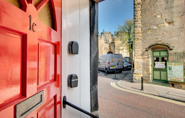 Access is from the main street, where four steps lead to the red front door. This entrance is shared with two other apartments in this historic townhouse. Once inside, the shared entrance hall, up one step, you will find the Barbican View's front door. The apartment has a spacious, open-plan hallway leading to the kitchen area, which also leads to the lounge / dining area. This cosy holiday apartment is on one level, making it very appealing for less mobile guests, although please note that there are two steps up to the bathroom door, which is accessed via the bedroom.