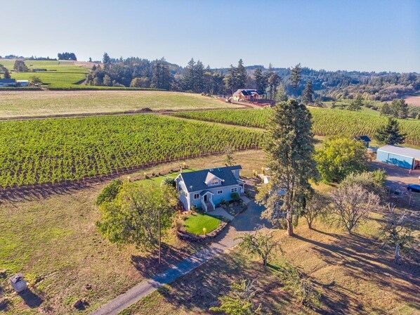 Located in the heart of the Eola Amity Hills, the farmhouse is within walking distance to Mystic Wines, and for those feeling adventurous, Brooks Winery is just a scenic hike uphill—with the return trip downhill all the way home. The property offers easy access to both Salem and the Oregon Coast, making it a convenient and inspiring base for exploring the best of the Willamette Valley.