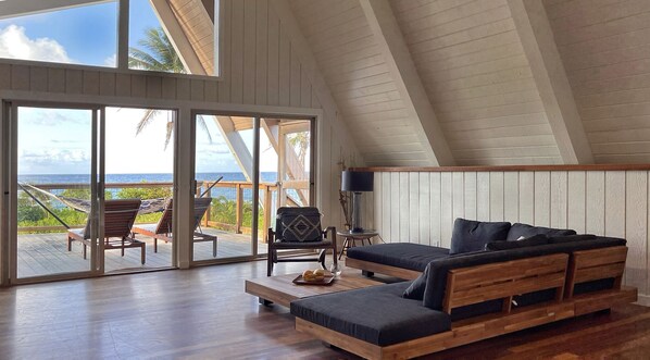 Imagine waking up to panoramic ocean views at our unique A-frame beachfront house, where you can comfortably unwind with family and friends. Enjoy meals and relaxation in the spacious 1200 sq ft open-plan living area, or step outside onto the extensive oceanfront lanai for alfresco dining, lounging in a double-size hammock, or soaking in the hot tub under starry skies.