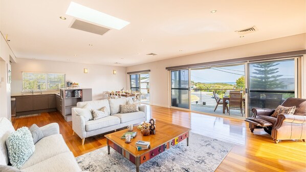 The dining area sits adjacent to a spacious, well-appointed kitchen featuring sleek stone benchtops and full cooking facilities — including a gas cooktop, oven, microwave, dishwasher, and a family-sized fridge/freezer — everything you need (and more) for a comfortable holiday stay. Step out onto the sunny back deck to unwind with a book and your morning coffee, all while overlooking the beautifully landscaped gardens.