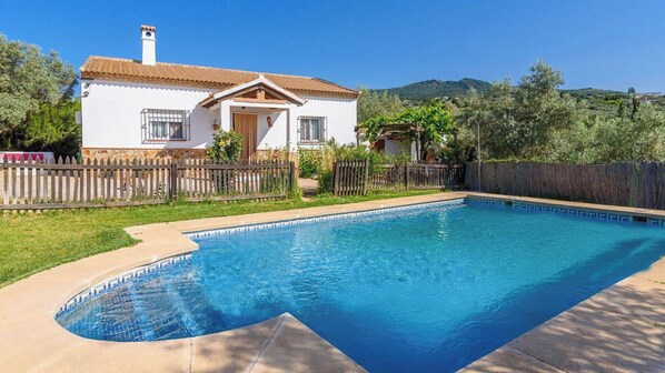 The house has two bedrooms. One with a double bed and a bathroom with a shower in suite and one with two single beds. There are other bathroom with a bath. Of course there is a living room and a kitchen. Outside there is a fenced pool with grape branches and trees that provide shadow. There is a barbecue awaiting you so you can prepare the best local food. At 10 minutes distance of the house you find the small village Pedania de La Higuera.