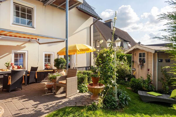 Located in Arnsberg, the holiday apartment Haus Ute has everything you need for a comfortable holiday. The 63 m² property consists of a living room with a sofa bed for 2 people, a well-equipped kitchen, 1 bedroom and 1 bathroom and can therefore accommodate 4 people. Additional amenities include Wi-Fi with a dedicated workspace for home office, a TV, a washing machine, a dryer as well as children's books and toys. A baby cot and a high chair are also available. This vacation rental offers a private outdoor space with a garden, covered terrace, and barbecue.