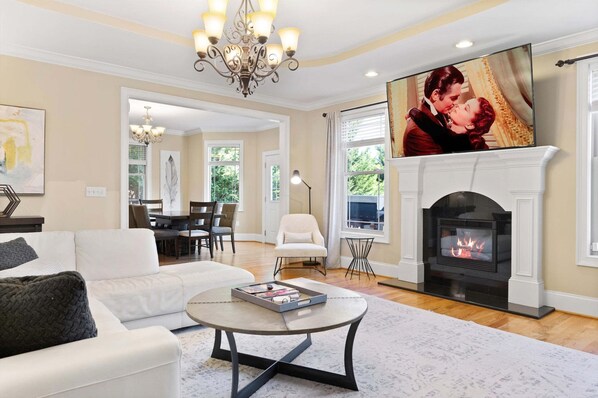 ⭐️ INDOOR FEATURES ⭐️ ★ MAIN LEVEL ★ • Sitting Room: Plush sofa for reading and a Smart TV • Living Room: Large Smart TV, electric fireplace, sectional sofa, and deck/balcony access. • Kitchen: Fully-equipped kitchen with cooktop, oven, Samsung fridge, and more. • Dining Area: 6-8 seater dining table + 3-seat breakfast bar. • Laundry Room: Ready to use washer & dryer, iron & ironing board - Laundry supplies provided