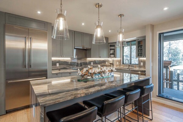 After a long day on the mountain relax and take in the serene river views . The primary living area serves as an exceptional space for entertainment, featuring a generously sized dining table, a kitchen bar with two bar stools, and a spacious living room with a genuine wood-burning fireplace. Samsung Smart TV & a Sonos speaker system to help you unwind while listening to your favorite tunes.