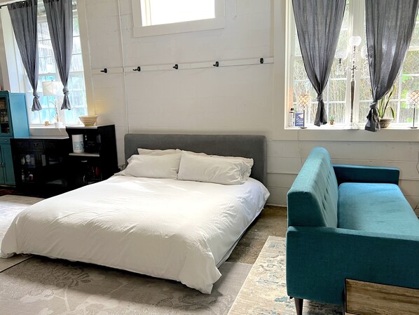 The Main room is furnished with a very comfortable King bed, Joybird couch and 65" smart TV, desk and chair, dresser and storage.