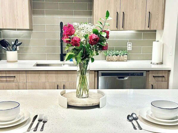 The kitchen is fully equipped with everything you need to prepare home-cooked meals. It features modern appliances such as a stove, refrigerator, microwave, coffee maker, and toaster, along with ample counter space and essential cookware. Whether you're making a quick breakfast or a full dinner, this kitchen has all the amenities required.