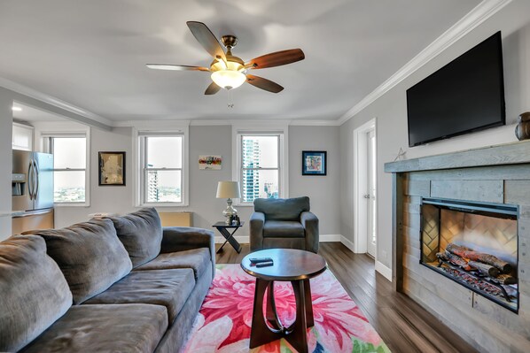 This top 24th floor non-smoking/ no pets/ penthouse has been lovingly and completely renovated from head to toe. Remodeled kitchen with quartz countertops, accent lighting and full size stainless appliances. Updated bathroom with deep soaking tub/shower- All new bamboo and tile flooring throughout. One bedroom condo with spacious living room and full kitchen - sparkling clean and beautiful. Other than being a prestigious penthouse unit, this is an extremely rare unit with a 100% private screened in balcony - you cannot see any other unit from your balcony - only miles and miles of spectacular skyline including the upbeat northern views of Peachtree Road, GA Tech, midtown, fabulous Piedmont Park, and I-20 and I-85 (in a wonderful and removed way that gives the awesome city buzz but yet so far up you can silence when you want). There are three elevators waiting to whisk you up and down as needed. Walk out the front door and you are smack dab in the heart of Downtown Atlanta. Impossible not to love this city! Enjoy glowing sunrises and sunsets from each room. Cozy up to the built in electric fireplace (awesome ambiance and it puts out extra heat). Spacious master bedroom has a newer Tempurpedic KING size bed. Insanely comfortable! The living room has a full size leather chaise sofa sectional (not a sleeper). Comfortable roll away twin day bed can be set up in living room (optional). This Penthouse is ideal for 1-3 people. The condo has dedicated wifi and 2 TV's -one smart TV in living room and one in bedroom. No better accommodations in downtown Atlanta in this price range. ***One up front RESERVED parking space comes complimentary with your reservation.