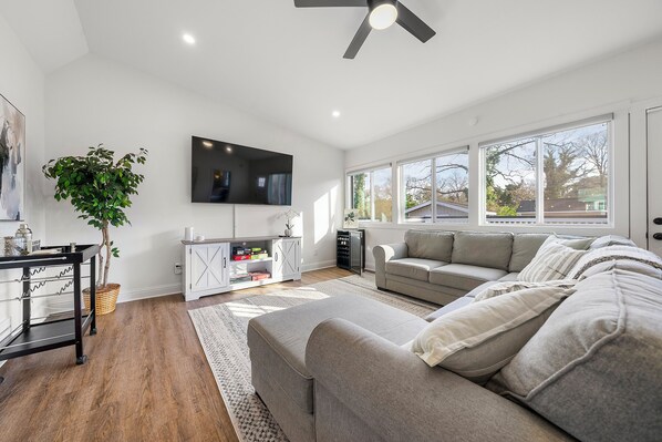 -Spacious Living Area – A large, cozy couch perfect for gathering, streaming on the smart TV, playing board games or unwinding after a day of exploring.