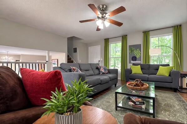 This house boast 4 inviting bedrooms wih 1 king-sized memory foam bed, 2 queen-sized memory foam beds, 1 Twin bunk beds and 1 queen air mattress, everyone will enjoy a comfortable and restful night's sleep. Each bedroom features its own TV, so you can unwind and enjoy your favorite shows when it's time to relax. Our bright, modern kitchen is an inviting space for preparing delicious meals and savoring morning coffee. The spacious living room offers cozy seating around a charming stone fireplace and a mounted TV, perfect for relaxing after a busy day. The versatile bonus room features a full-size pull-out sofa bed and a cozy seating area, making it ideal for additional guests or social gatherings. For family fun, there are plenty of board games to enjoy together. Whether you're gathering for a movie night, playing games, or simply unwinding, this beautifully furnished home provides the perfect setting for your vacation — comfort, style, and endless entertainment in one!