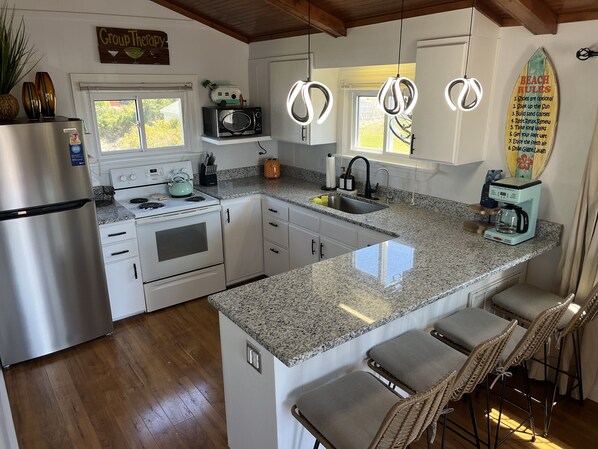Fridge, microwave, oven, stovetop - Bubbles Up Surf Shack-3 BD Dog Friendly-Reno'd 2024-Walk to best of Atlantic Bch (Atlantic Beach)