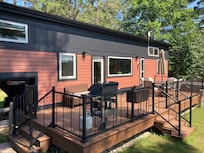 You drive down a gravel road wondering if you have the right location and if this rental is legit. Then you enter the property that has been developed into a beautiful community of tiny homes that all have their own separate space. You can hear neighbors from time to time but you do not see them. Once you park and come around to the back of property it opens up to a beautifully landscaped area - composite decking, Weber grill, patio fire pit with nice seating and stone stairway to the river. The kids loved fishing and the sunset into the trees was beautiful as they fished. During the day you see people tubing and kayaking by the property. This was our first time staying in a “tiny house” which exceeded our expectations!!! I had assumed it would feel like a “souped” up 5th wheel trailer but it was way - way more than that. It is very custom with A/C units in every section, solid wood finishing, nicely decorated to feel homey, and a bathroom that although still small it is spacious. We assumed we would run out of hot water and that never happened. Plenty of fridge space and beautiful stove to cook on. We were shock to see that it had a washer / dryer combo although we didn’t use it. You really don’t need anything except cloths and food…there was even firewood left for us. As the rental is used more I could see it having salt and pepper, matches / fire started and Deet. These were all things we had to get that previous VRBOs have had.