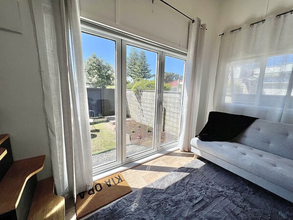 The house has high ceilings in the living area making it a spacious and open space to relax in. New blinds and privacy curtains cover the double-glazed windows and a large tri-fold door, connects the indoors to a lovely private garden space. When you arrive at our tiny house, it's a breeze. Simply drive down the driveway for a quick bag drop-off, keeping in mind that off-street parking isn't available. Instead, we recommend using the safe and convenient street parking. The private entrance the Tiny House is secured with a fence and screening, giving you an extra layer of privacy.
