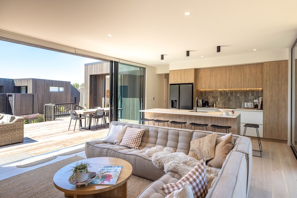 There are 3 bedrooms & 2 bathrooms (main with ensuite). Two of the bedrooms have super king beds, and open onto the decks, the third bedroom offers two king singles. Professionally laundered linen is provided.