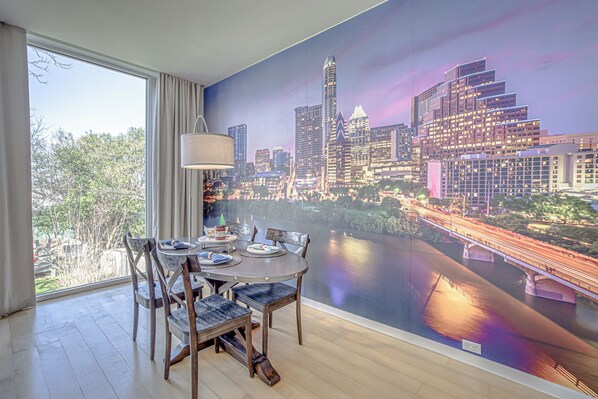 On the second floor, which consists of the Living/Dining/Kitchen area, you will surely be pleased. The dining area also serves as an ideal workspace for business travelers. A picturesque open kitchen with ample space with additional seating for 3.