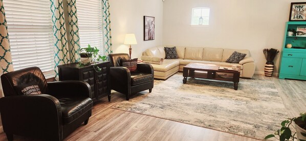 Enjoy coffee + cocktails + conversation as you relax on the spacious front porch or gather with friends for a BBQ in the giant backyard. With comfortable outdoor seating, this is the perfect spot to relax under the Texas stars after a day of exploring.