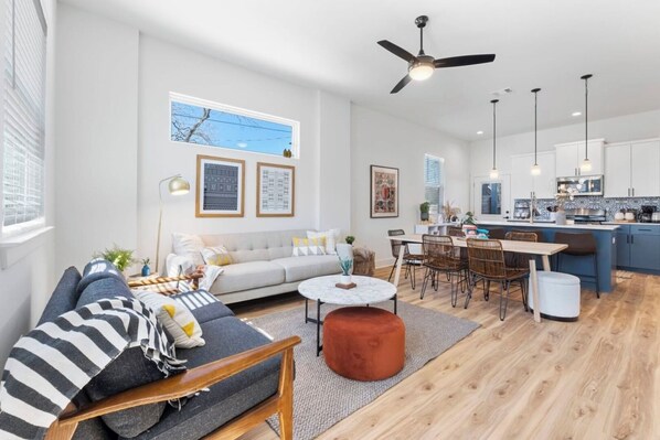 Soak in Austin from this stylish hip stay. Take your morning coffee to the private patio, gather 'round the cozy living room, or take a nap in one of the scrumptious bedrooms. Enjoy meals in this modern, stocked kitchen. Curated for families or groups who want space to connect and explore. Bright and airy,