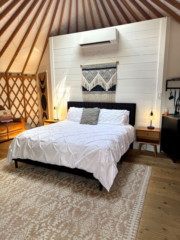 The yurt is an actual wood-framed tent, and if you`ve heard of `glamping` (glamorous camping), that`s what this is! While the yurt is a great shelter from the sun and the wind and most effects of the elements, the structure is not air tight and is subject to some fluctuations in temperature (though it has a large mini split a/c and heater to mitigate the temps), wind noise and occasional bugs :). So just so we`re all clear, the yurt is a true glamping experience!