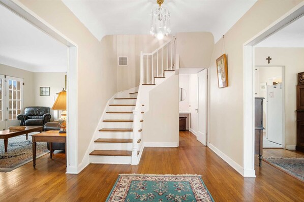 The exterior stonework, and the grand living and dining room, evoke both comfort and elegance. Both floors are kept comfortable with central air and heating. The kitchen is fully appointed with appliances and cooking and serving utensils, and a washer and dryer are available for stays four days or longer. There are three full baths upstairs, and tucked beneath the staircase downstairs is an additional half-bath. Four bedrooms upstairs supply plush sleeping arrangements for up to tem people on a total of six beds. (Additional guests may sleep on air mattresses, which you provide; please inquire when booking.) The TV in the living room is hooked up with Roku service, and the one in the master bedroom has a DVD player. Wifi Internet access and good cell service are also on hand here.