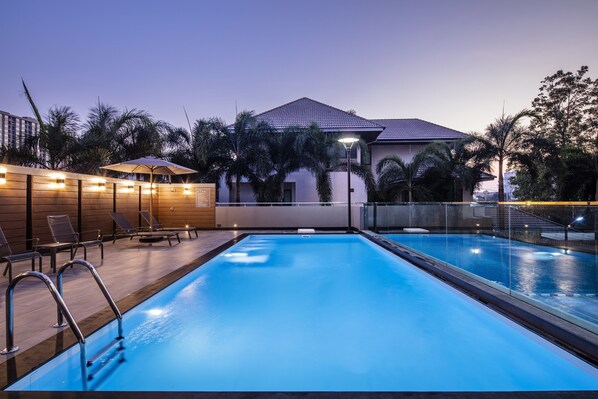 Travelers find a peaceful retreat in Bangkok with an outdoor pool for relaxation and authentic Thai breakfast cuisine to start their day right
