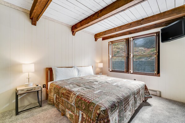 Inside, cook up meals together in the full kitchen (no dishwasher) and enjoy them in the dining area or around the gas fireplace. The relaxing loft space makes for an excellent reading nook or extra sleeping space. Take in a game of air hockey on the lowest floor while the clothes for the day go around in the private washer/dryer. Enjoy peace and tranquility in this rustic-inspired home in a quiet location.