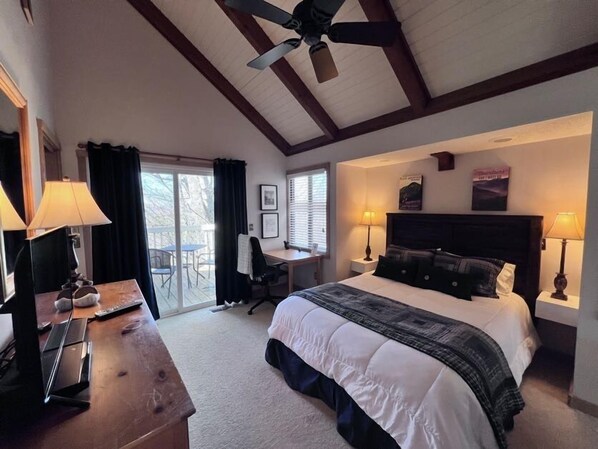 The Owlery at Sugar is a unique 3 story mountain chalet with 2 decks that sits at the base of Sugar Mountain. This home provides level entry. On the main floor, you will find a completely updated kitchen, dining area with views of the mountains, living area with a wall of windows allowing plenty of natural light, tongue, and groove ceilings with exposed beams, ceiling fan, stone gas log fireplace, and large smart TV. Both bedrooms are also located on the main floor. The master features a queen bed with an en-suite bath. and a large jacuzzi soaking room. The room also has sliding glass doors opening onto the deck. The second bedroom features a queen bed and an adjoining bath. Each bedroom has a ceiling fan and a smart TV.