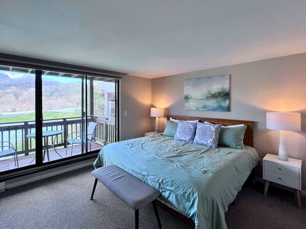 At your home away from home, the private deck serves as the ideal setting for morning coffee, evening drinks, or alfresco dining, all while enjoying the picturesque pond and mountain views. With ample seating and stunning vistas available from the two decks, relaxation is guaranteed.