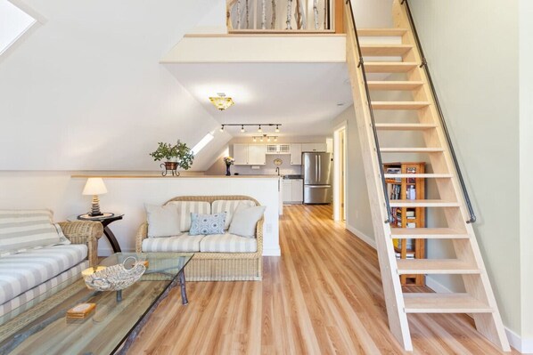 This bungalow has 2 bedrooms and a loft. The loft is accessed with a ships ladder. There is a TV in the loft and in the living room. There is a futon couch in the loft that can be used for sleeping if needed.