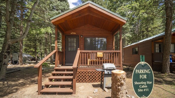 A personal gas grill, picnic table, and firepit are setup outside your cabin for the optimal camping experience!