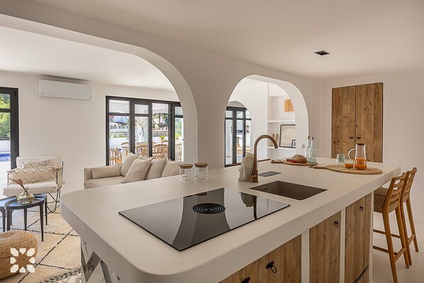 LAYOUT: Located just moments away from the tranquil shores of Cala Advocat, Villa CASA BLANC offers a luxurious retreat with sea views and a perfect blend of diverse interior design styles. This exclusive holiday villa in Benissa is thoughtfully decorated to transport you through three distinct worlds—Marrakech, Scandinavian, and Ibiza—while providing every modern comfort for a peaceful Mediterranean escape. Once entering the property, by going up the stairs, we encounter to our left a large sized pool area, where we find all the comfort and privacy we need to enjoy a fantastic times with our family and friends. Around this pool, you’ll find beautiful colonial-style sunbeds, made from light wood with hand-woven rattan backs and plush white cushions for maximum comfort. These classic loungers evoke timeless elegance, perfect for relaxing in style. Straw umbrellas are strategically placed which offer the perfect balance of sun and shade, ensuring both comfort and style.Right next to the pool is a beautifully designed white wood bar area, offering a chic and functional space for poolside refreshments. The bar offers a grill to make delicious meals whilst being with our loved ones.