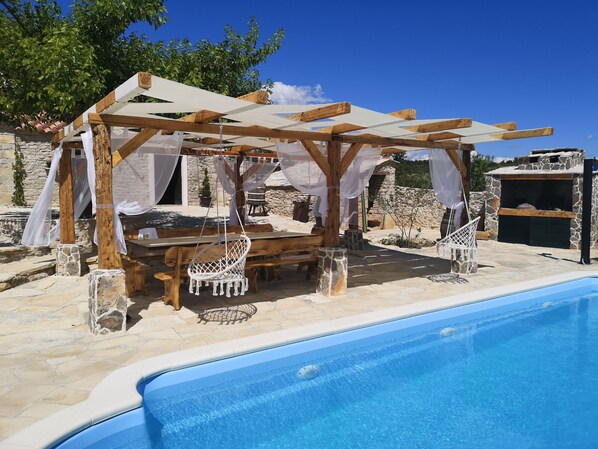 Nestled in the charming village of Kula Atlagic, this 2020 house offers a serene retreat for an unforgettable family holiday. With 5 bedrooms and equipped kitchens, relax by the pool or explore nearby beaches and national parks like Krka, then unwind with wine while taking in views of endless hills.