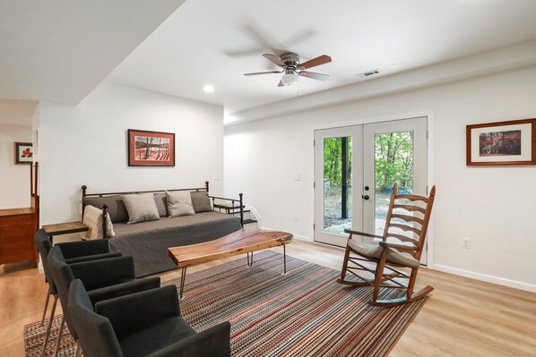 The real gem is the spacious outdoor area- hammock swings and Adirondack chairs surround a firepit, outdoor cornhole and bocce offer activities, and the yard is well set for a create your own mountain bike trail for kids and adults alike. A new weber propane grill and bistro table are available for making the perfect meal outside. The retreat also features a large screened in porch- perfect for bird watching with a cup of coffee in the mornings. Check out the bird station/ window just off the porch as well as provided binoculars and birding guides.