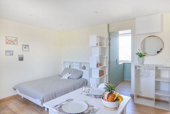 Le haut de la Roseraie "Petit studio très sympathique proche de la plage et de commerce. Propre et conforme aux photos. Petit bémol : Dommage que les draps, teille d’oreiller ainsi que les serviette de douche ne sont pas fournis.."