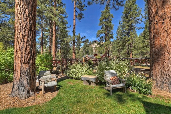 The back yard offers a fantastic space for relaxation and fun. Enjoy the covered deck with smart TV, gas barbecue, and various seating options. Unwind in the hot tub after a day of exploring. The yard is fenced for privacy, and there’s an adjoining open lot (private property, not for tenant use).