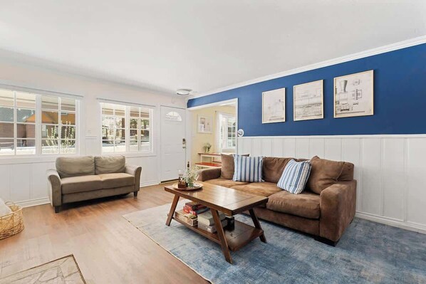 Kitchen: Full-sized stainless-steel fridge, gas stove, dishwasher, microwave, large apron sink, drip coffee maker, toaster, and grill press. Fully stocked with utensils, cookware, bakeware, and dinnerware.