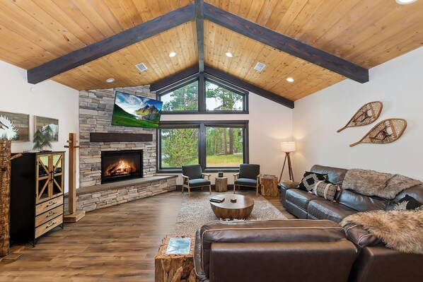 Step through the oversized front door and be welcomed by rich hardwood floors that lead into the open-concept living area. Vaulted ceilings and wood beam accents frame the space, creating a warm, inviting atmosphere. The living room features a leather L-shaped couch, a floor-to-ceiling rock gas fireplace, and a large flat-screen smart TV. Enjoy the peek-a-boo views of the lake and the perfect setting for relaxation and entertainment.