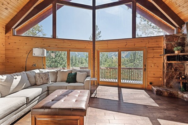 Step out onto the expansive deck to witness nature's grandeur; this outdoor haven is equipped with plush seating, ideal for morning reflections with coffee or evening toasts with wine. Here, every moment is an invitation to relax and connect with the breathtaking scenery.