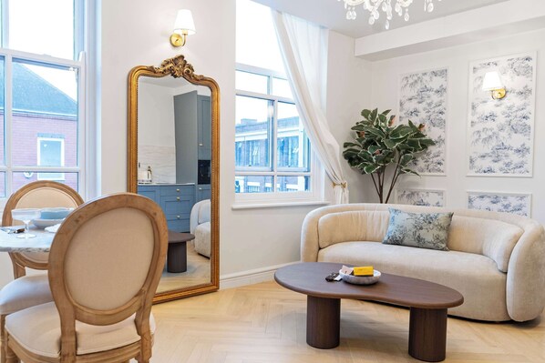 Step into Parisian elegance in the heart of Birmingham’s Jewellery Quarter. This beautifully styled one-bedroom apartment blends chic French décor with modern comforts — featuring a separate bedroom with a plush double bed, a cosy living area, and a luxurious bathroom.