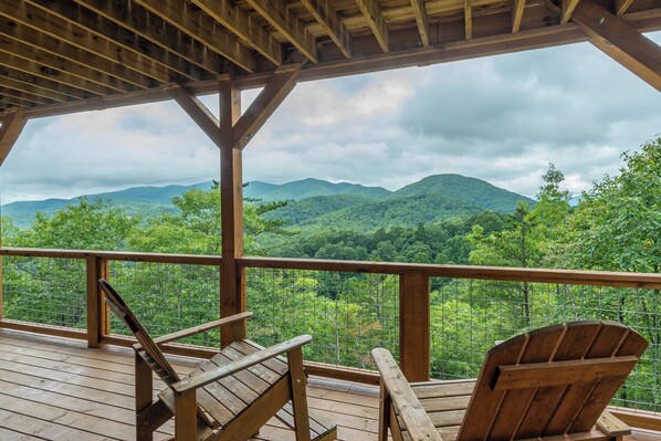 • Two wraparound decks with panoramic mountain views; the open-air, upper-level deck offers a picnic table and a variety of seating, and the covered, lower-level deck offers a vintage clawfoot soaking tub and swings