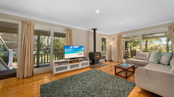 Enjoy the all-weather alfresco entertaining area and wrap-around verandah overlooking the natural setting. Inside, a fully equipped eat-in kitchen with gas cooking, a cozy lounge with a wood fireplace, and free Wi-Fi ensure complete comfort.