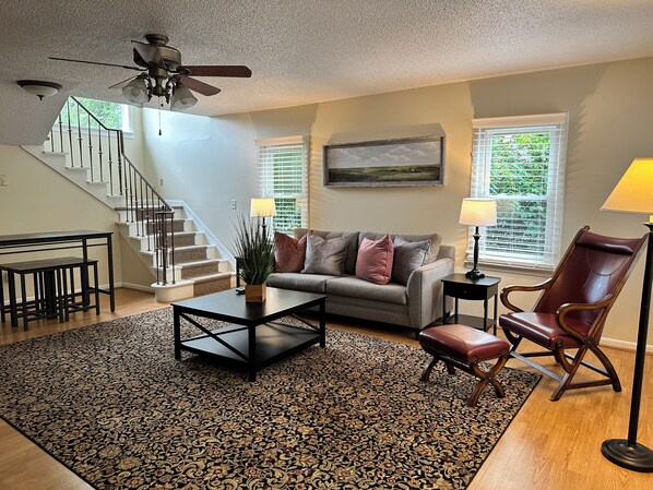 Mountain charm awaits at this cozy retreat where guests warm themselves by the firepit or enjoy the natural surroundings in comfortable outdoor seating