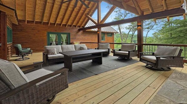 The living room invites you to unwind with its cozy furnishings, gas fireplace, and flat-screen TV. Knotty pine walls and oak flooring throughout the home enhance the cabin's warm, inviting ambiance. Step outside from the living area onto the screened-in back porch, where you can savor breathtaking mountain views by the wood-burning fireplace or watch your favorite shows on the outdoor TV. Downstairs, you'll find a hot tub and an outdoor dining area, perfect for enjoying meals al fresco.