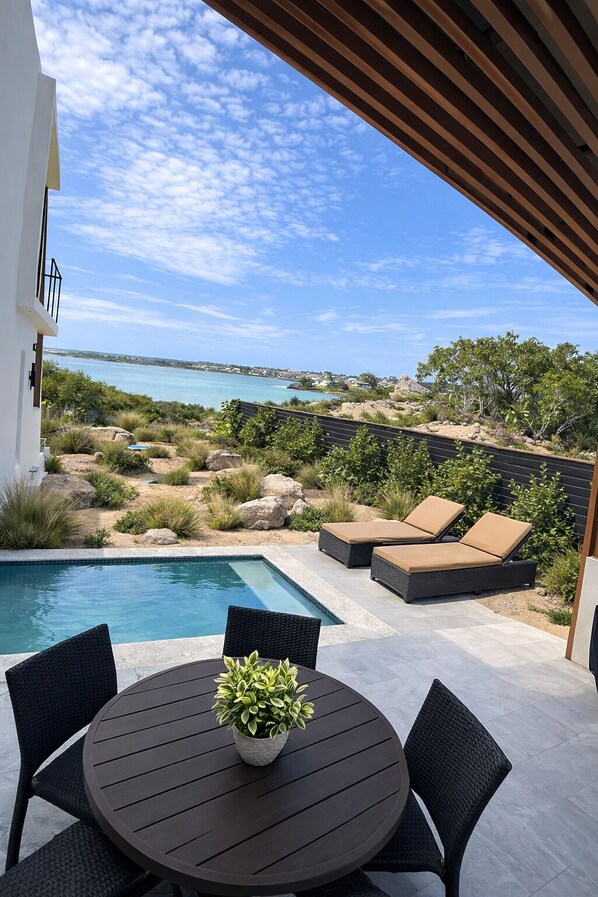 All guest rooms at Panoramic Turquoise Views Villa 1 boast thoughtful touches, such as private pools and air conditioning, in addition to amenities, such as dining tables and kitchen islands.