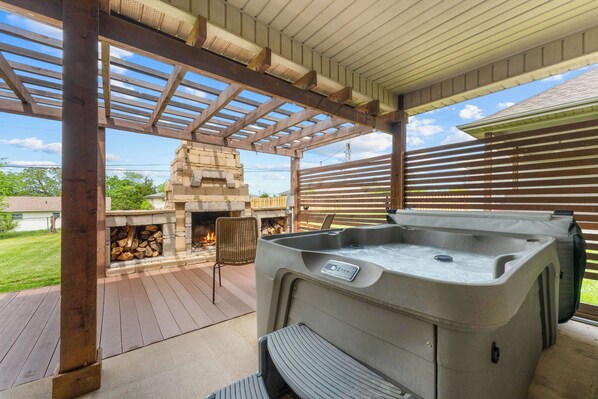 Then out the back is a generous back patio with an electric grill, an outdoor dining table, your own private HOT TUB, and a large stone wood burning FIREPLACE! Plus a large, grassy backyard with room for your kiddos to run and play!
