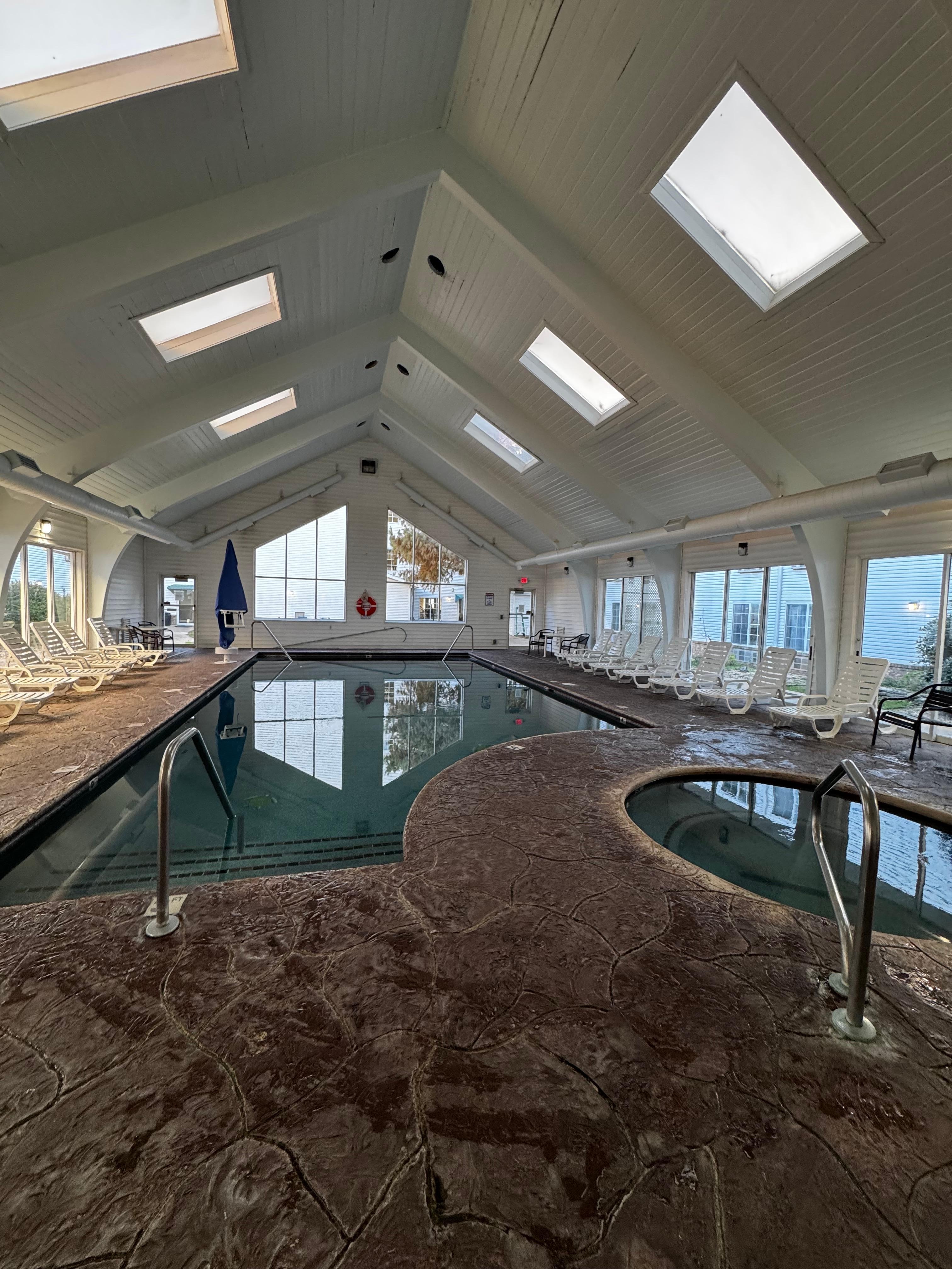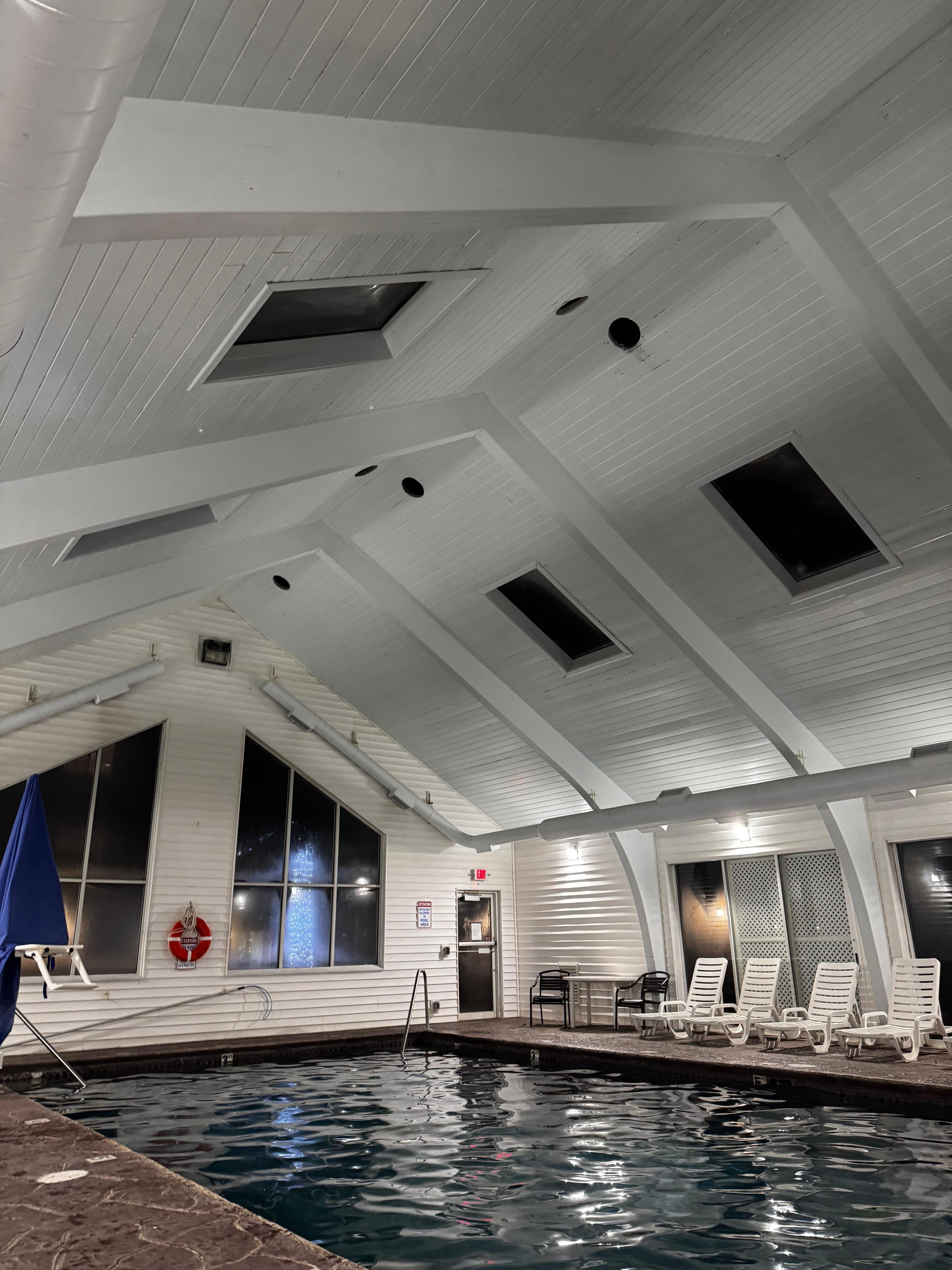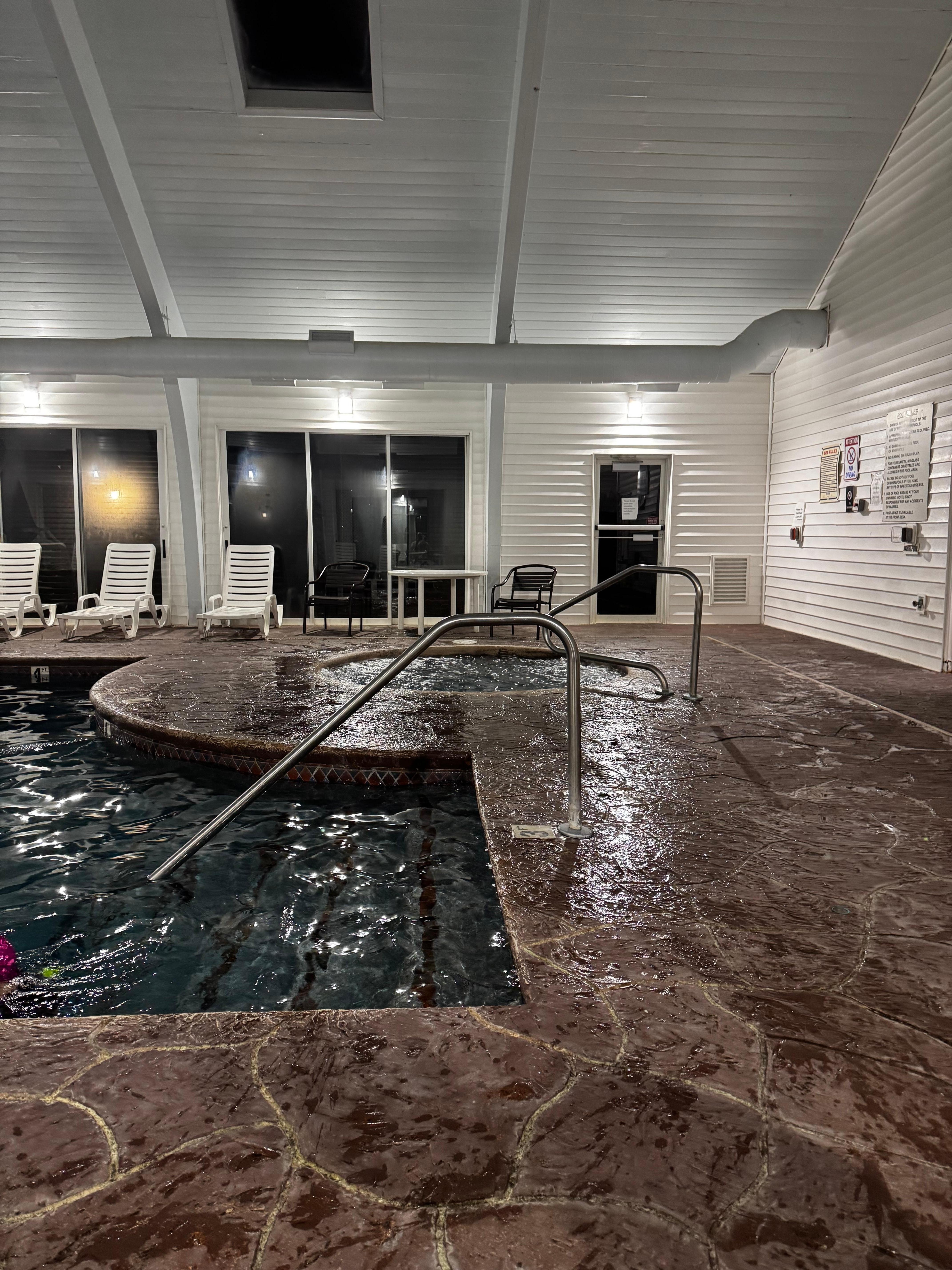 Travelers gather by the welcoming fireplace or relax at the indoor pool with loungers at this comfortable retreat for a memorable stay.